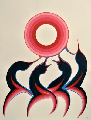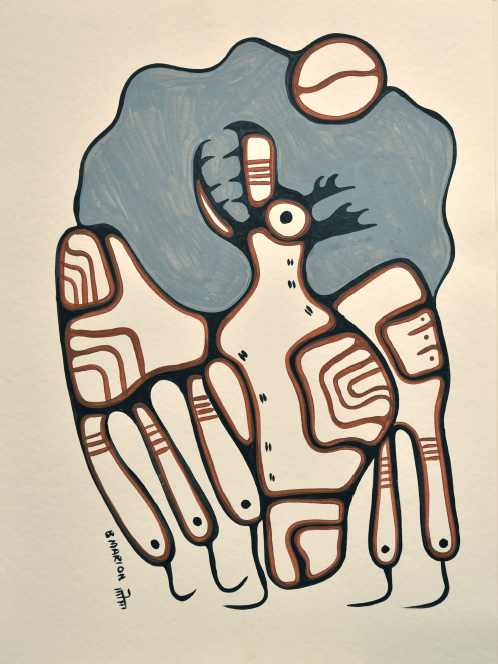 Little Hummingbird refers to the artist, the late Brian Marion. "Hummingbird Soars with Thunderbird" honours a man’s life and death through verse rooted in the Ojibwe imagery of animals and mystical beings. Repeating first and last verses reflect the cyclical nature of all life. The poem was written in a spirit of gratitude for Brian Marion’s art including this powerful, untitled piece.